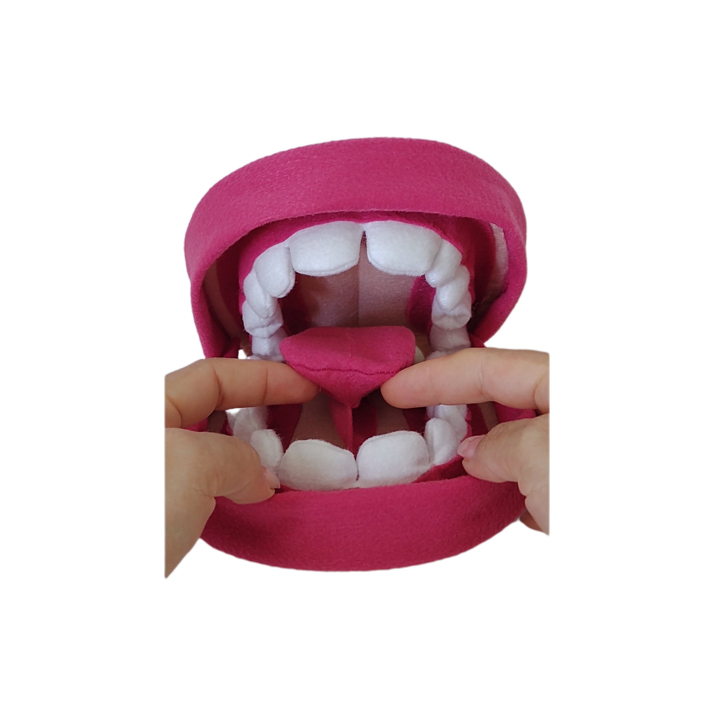 Boca Lúdica Fantoche Mini, medindo 10 x 12 cm (fechada) e 10 x 22cm (totalmente aberta) com demonstrativo de frenulo lingual encurtado, o frenulo é fixado com um botão de pressão podendo ser utilizada a lingua com ou sem o frenulo encurtado. Com as arcadas e a lingua fantoche que facilictam a reprodução dos movimentos articulatórios da lingua.