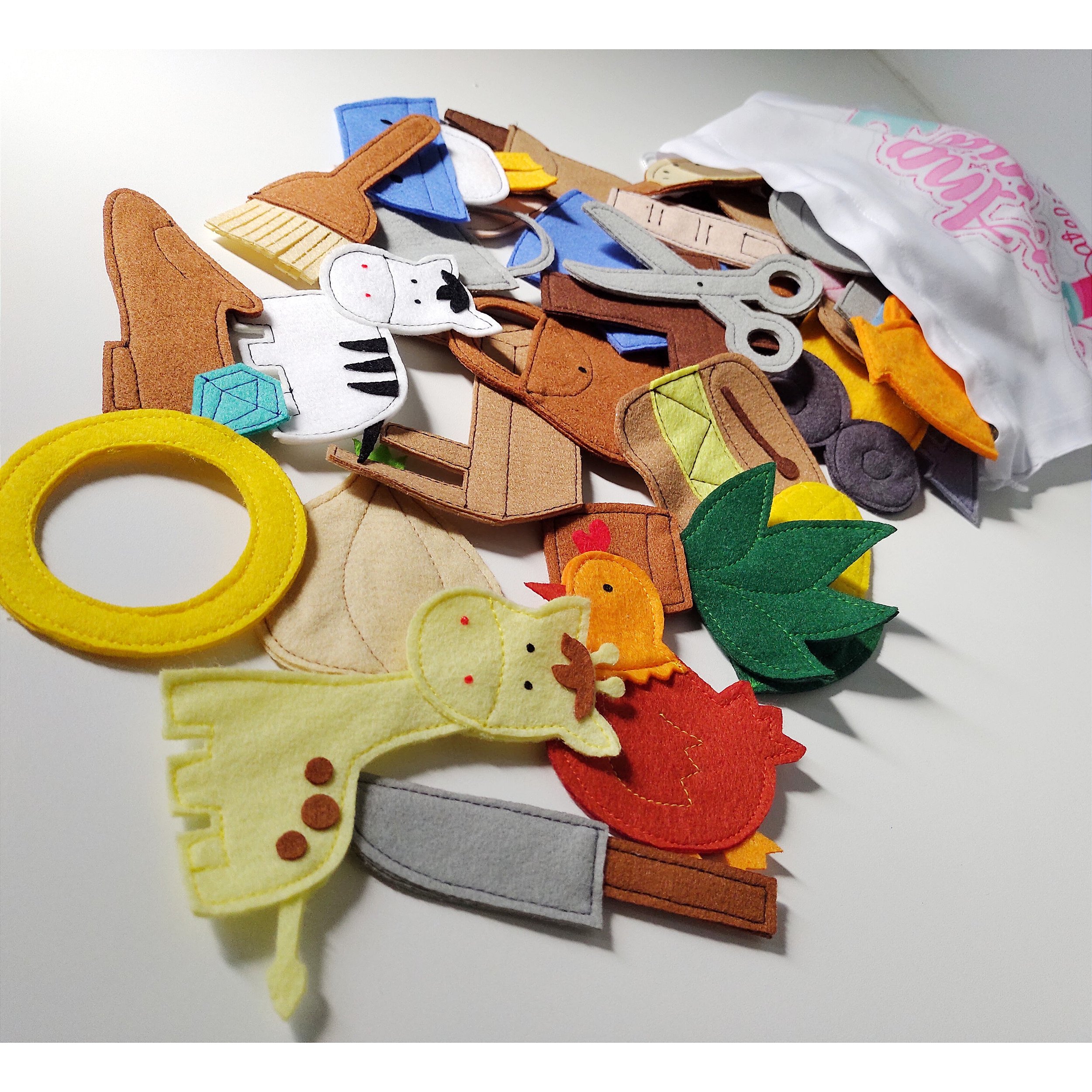 O kit acompanha 34 figuras em feltro todos costurados a máquina em tamanhos variados entre 08 à 12 cm, acompanha sacola para armazenamento.