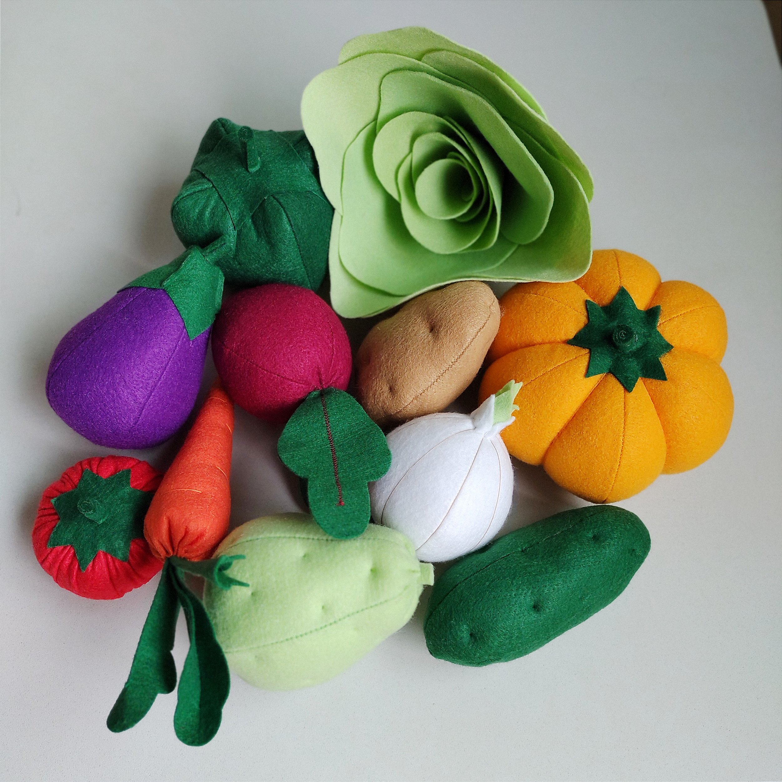 kit com 11 legumes: cenoura, beterraba, alface, pimentão, cebola, pepino, batata inglesa, berinjela, tomate e abobora. Todos em feltro e em formato 3D.